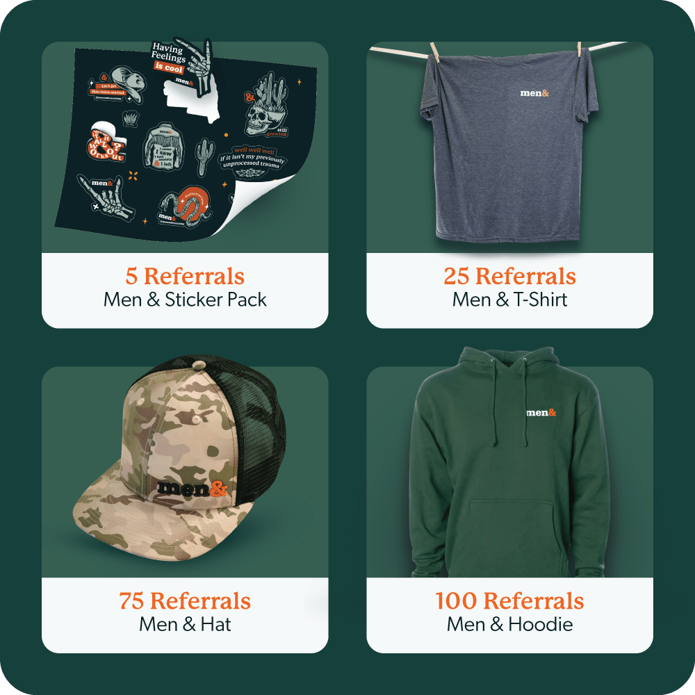 When you refer new readers to the Men & Weekly, you can earn Men & Merch! You’ll also be the first to learn of anything new that’s happening with Men &.